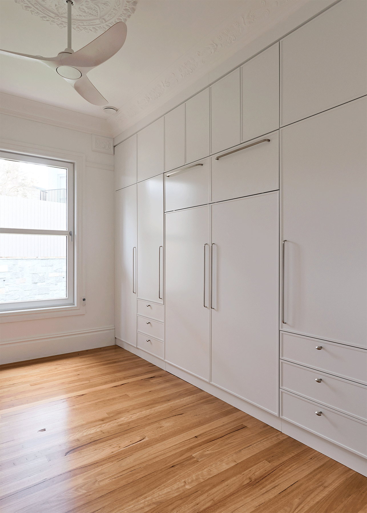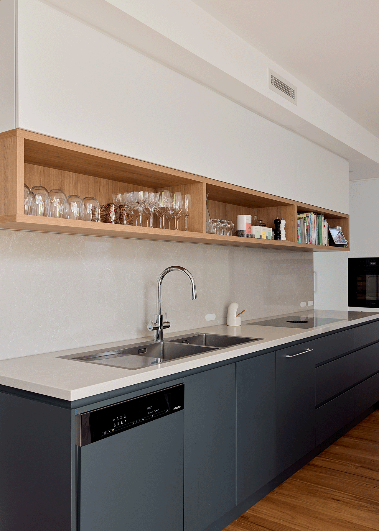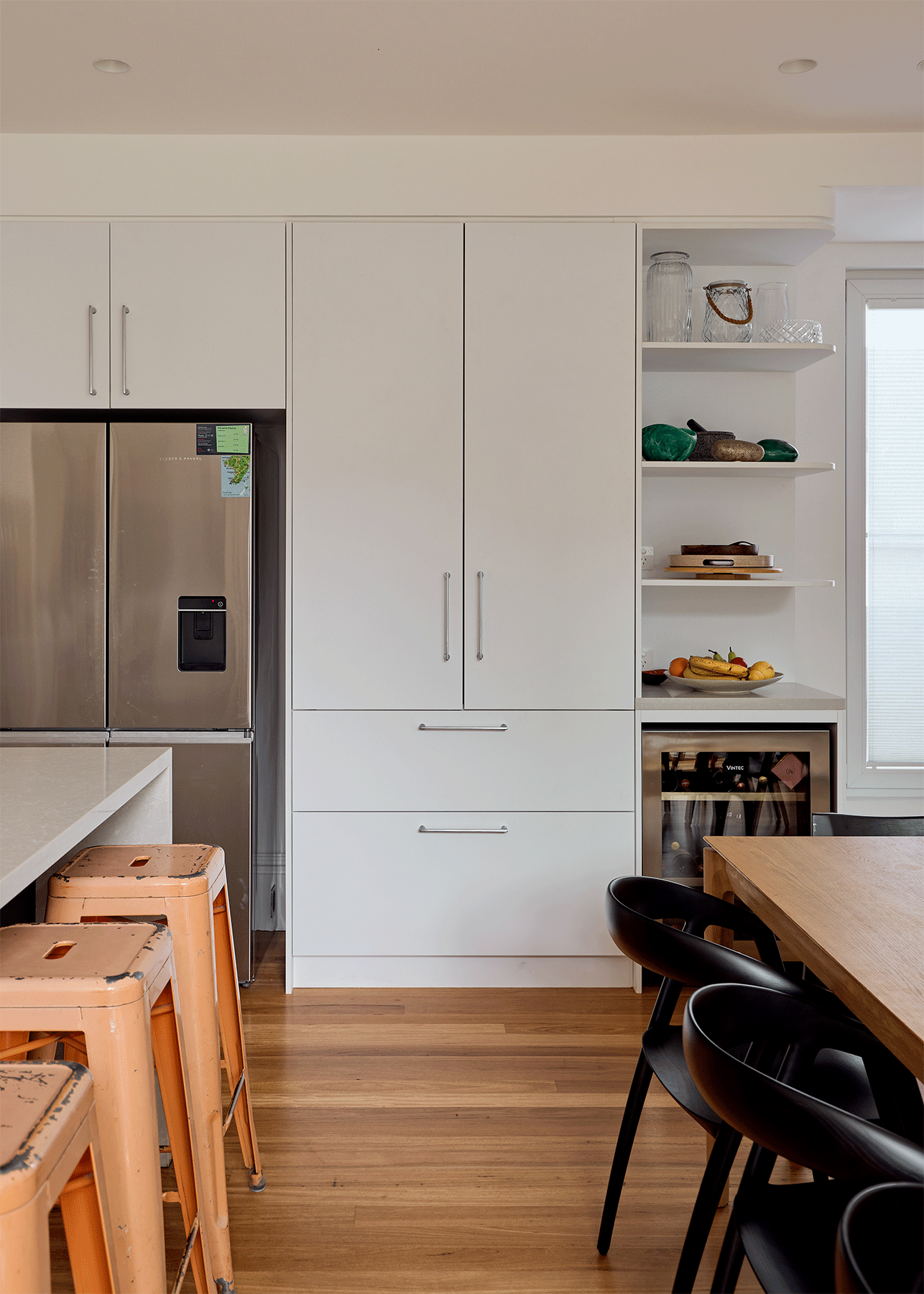 Cabinet Doors & Panels | Base cabinetry in Polytec Adriatic Venette finish G2S melamine and Tall and Wall cabinets in Laminex Calm White with laser edge melamine