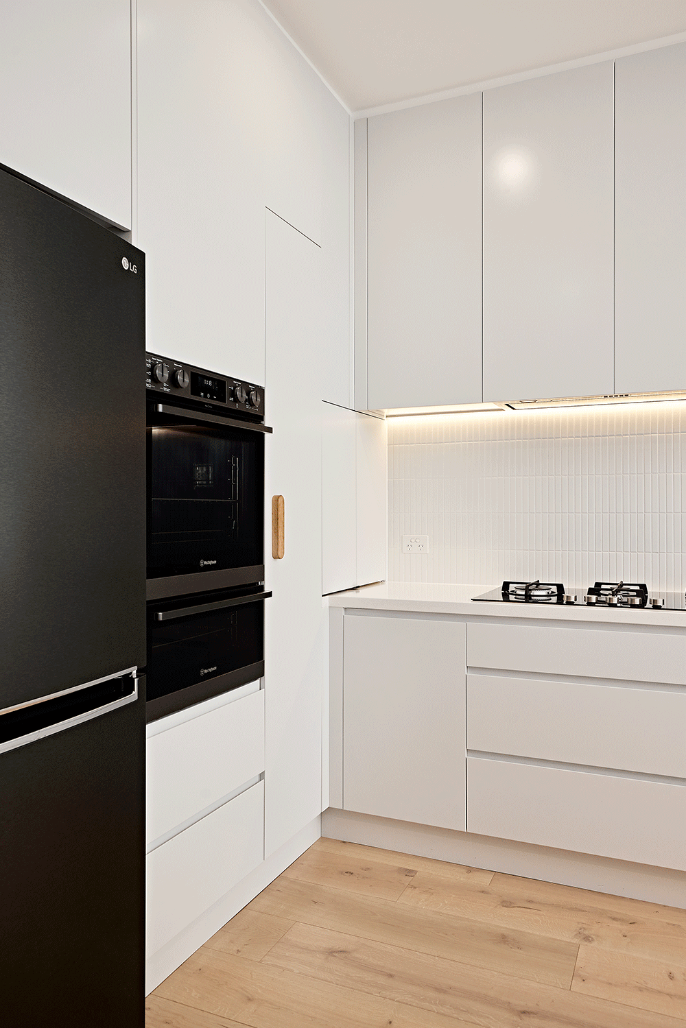 Additional Features | Integrated bin drawer, pull out pantry, LED strip lighting & bi-fold pantry doors​​