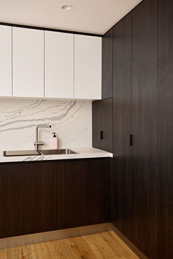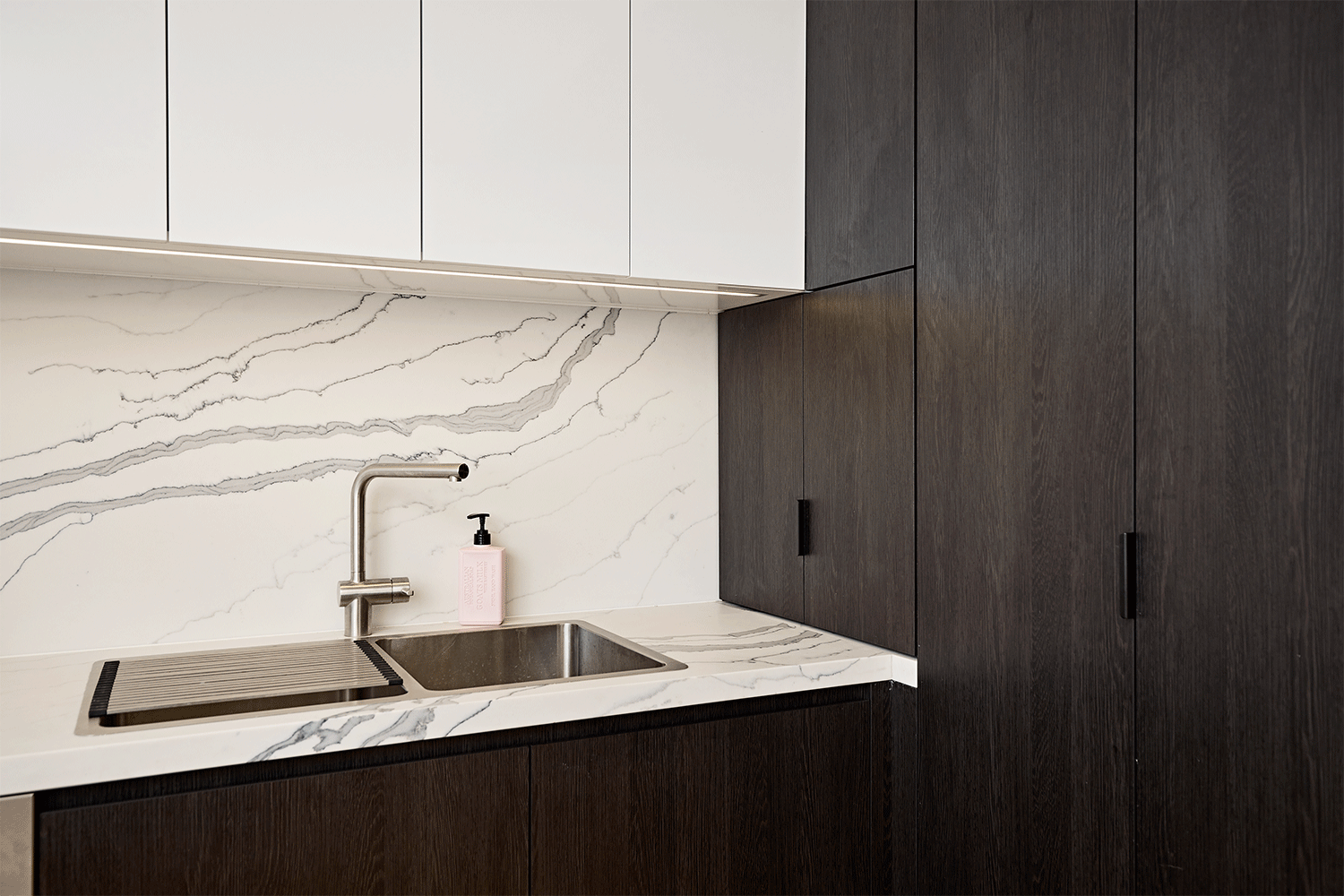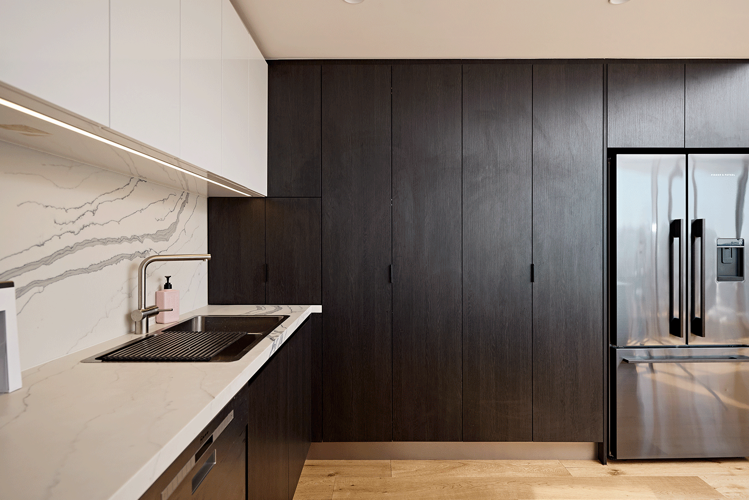 Cabinet Doors & Panels | Wall cabinets in Polytec Polar White Sheen and Base cabinets in Polytec Black Wenge Ravine